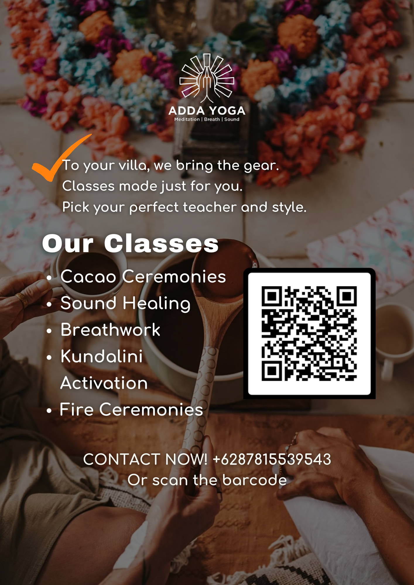 Check our amazing events in Bali ( private at your place or at our studio ) : fire ceremony, Private Cacao ceremony at your place , Private kundalini activation ,