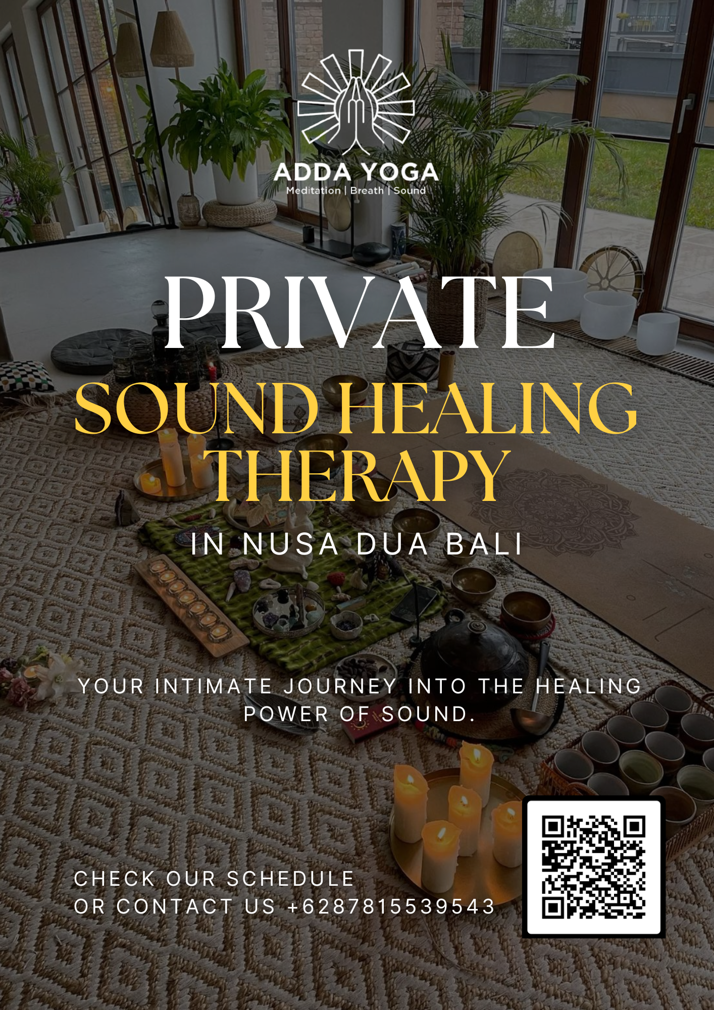 Discover transformative private sound healing in Nusa Dua, Bali with ADDA YOGA. Realign your chakras, reduce stress, and find inner peace with personalized sessions. Book your sacred journey ion the serene settings of your villa or hotel today !