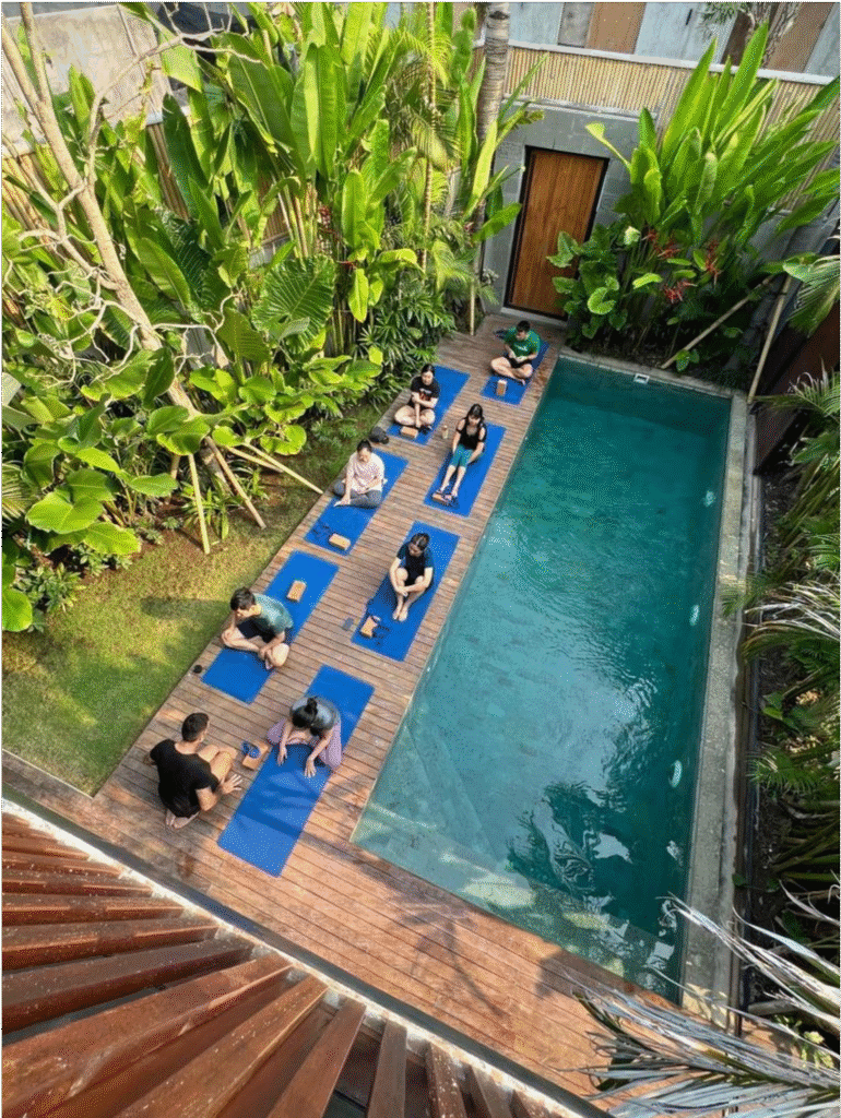 Beyond private yoga classes, we offer sound healing, floating sound healing, kundalini activation, cacao ceremonies, traditional fire ceremonies, melukat (Balinese water blessing), and reiki healing. These transformative events blend yoga practice with ancient wisdom for profound experiences.