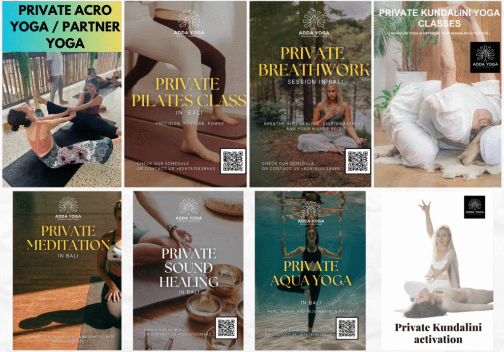 Private yoga sessions at ADDA YOGA Bali are customized specifically to your individual needs, experience level, and goals. Our certified yoga instructor focuses entirely on you, adjusting poses, breathwork, and teaching methods for maximum benefit. While group yoga offers community connection, private classes provide personalized attention that accelerates your yoga journey.