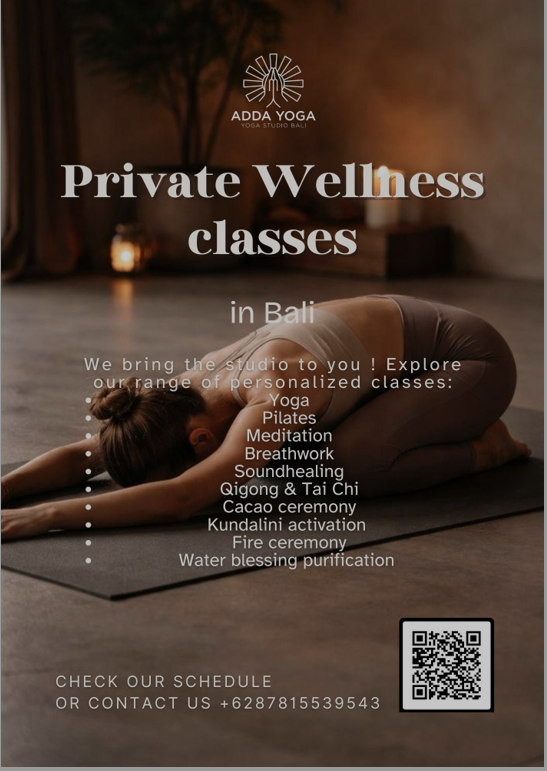 We also offer private yoga session. We serve all Bali ! Canggu, Seminyak , Ubud, Uluwatu. Sanur, Nusa Dua, Seminyak, Umalas, Seseh, Kuta Bali
