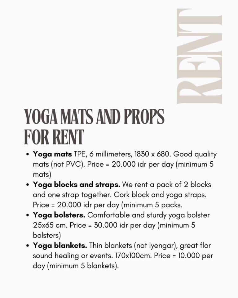 ✔️ We rent Yoga mats in Bali, Yoga bolsters, Yoga blocks, Yoga straps and all the gears needed for your workshop, Yoga retreats or private Yoga class ✔️ DELIVERED IN ALL BALI ( Transport cost at your charge )